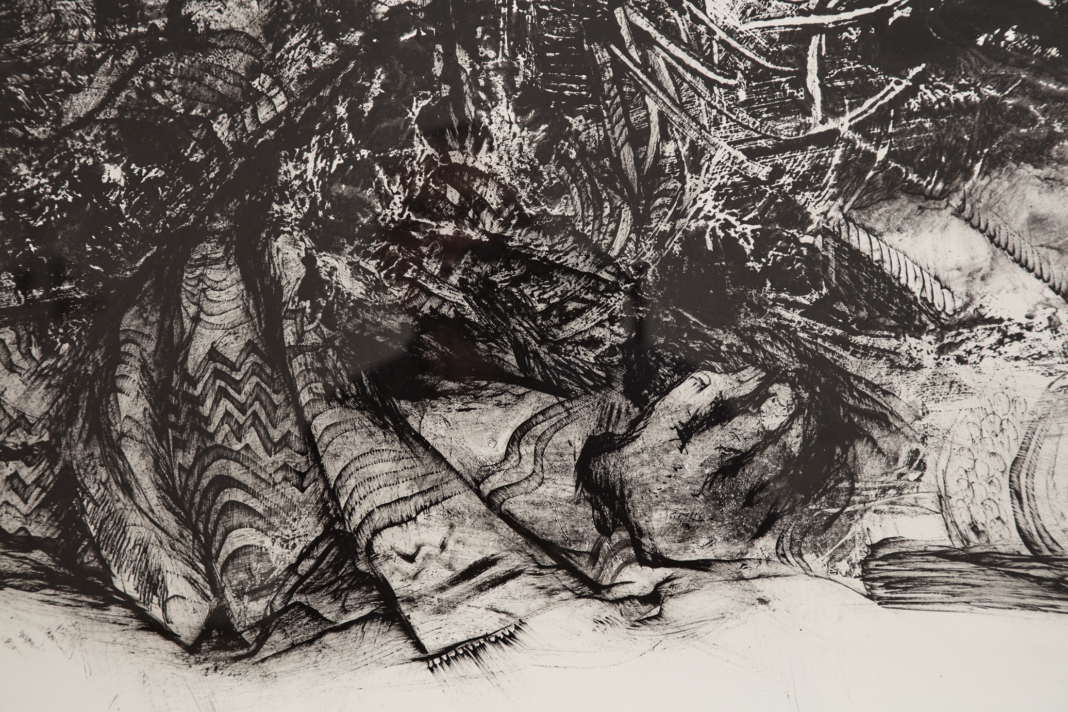 In Seeing Through Babel the Syrian-Armenian artist Kevork Mourad explores the story of Babel, using visual imagery to connect people across the language divide. While language often defines and separates people, imagery is a universal that connects people in the past and today. His work was created in-situ in the space, using a monotype technique in addition to direct drawing onto the surface of the work.
