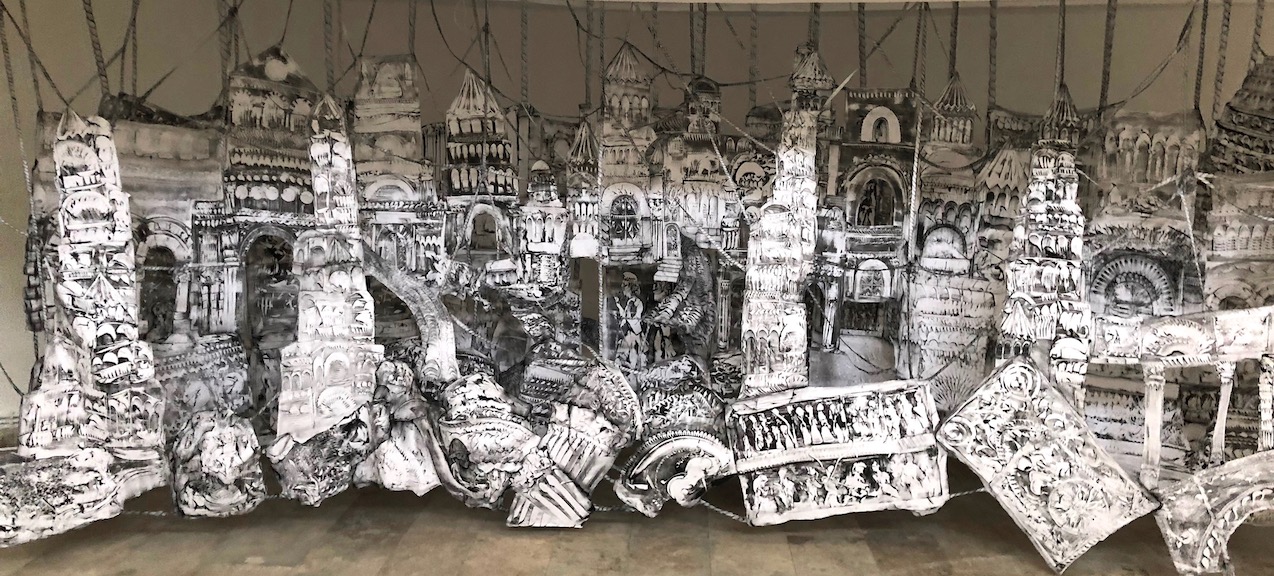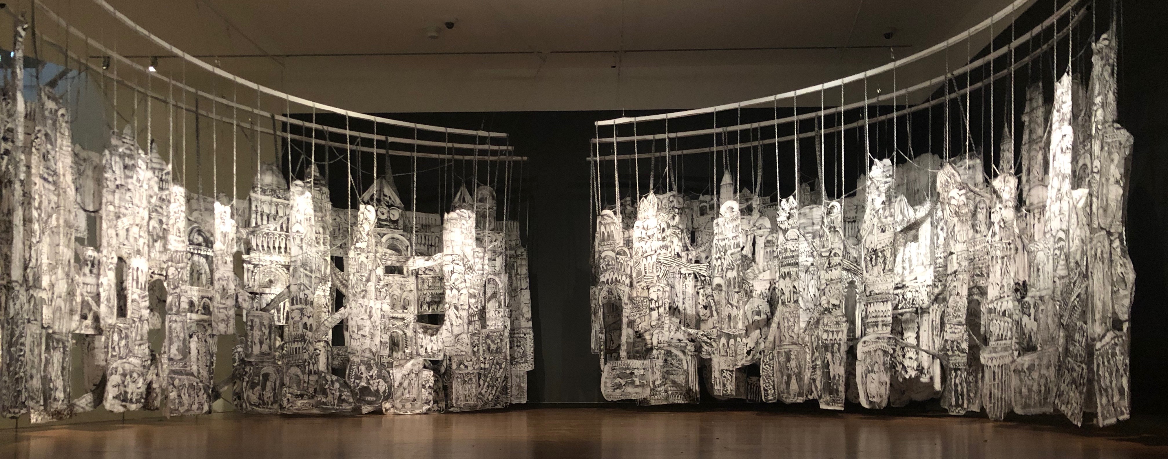 Through this piece, made up of three cut-out layers of drawing on muslin (2.40 x 6.00 meters), I am exploring the complexity of living in a place of many faiths, of many cultures. I’ve always been drawn to the beauty of diversity, but there is also the challenge of keeping one’s cultural identity in the midst of many. I’ve always felt the importance of staying connected to my roots while belonging to my surroundings, finding my voice while listening to those around me. And while exploring the wealth of the place I am in, I am always looking into what came before. To discover the many layers that make up a society, it is necessary to travel into its past; a place has as many histories as there are voices to tell it.