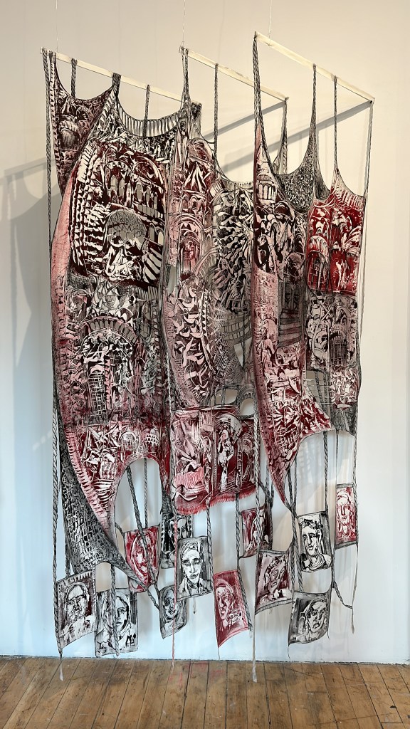 The entire structure is made of cotton fabric, with crimson and black acrylic paint.